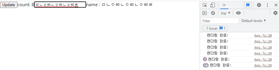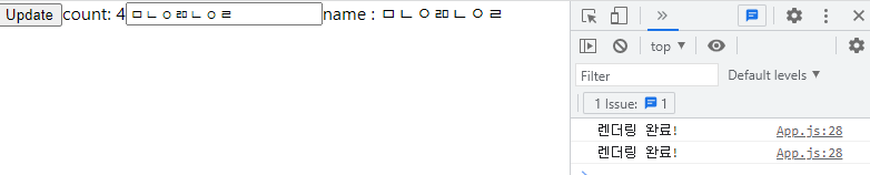 처음 새로고침을 할 때 useEffect 실행되어 console.log를 찍어 보여주고 Update버튼을 눌러서 재 렌더링이 일어나면