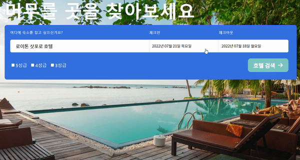 - 내가 원하는 체크인, 체크아웃 날짜를 선택하여 데이터를 보내 줄 예정이다 지금은 데이트피커라는 라이브러리를 통해